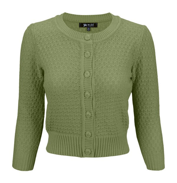 -17.5"-19" Crop Length, 3/4 Sleeves, Round Neck Knit Cardigan Sweater with Adorable Vintage Buttons All the Way Up to the Crew Neckline, Ribbing Detail at Collar, Cuffs, and Hem. -High Quality Soft Cotton Woman Cardigan Sweater Fits Well For Any Occasion. -Matches Well with Swing Skirts, Vintage Style Skirts, Dresses, and Pants. -Perfect for Vintage Inspired Fashion Lovers! - Kids size available : MK3514KID - Plus size available : MK3514PL