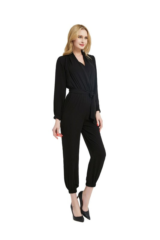 Easy wear long sleeve cross-over V neck, waist tie detail and a relaxed silhouette with elastic cuffs at wrists and ankles.
