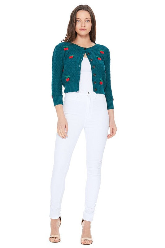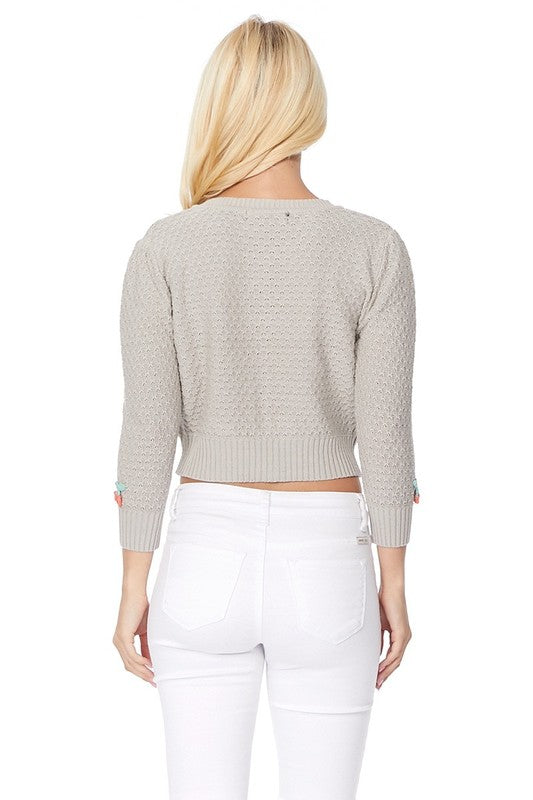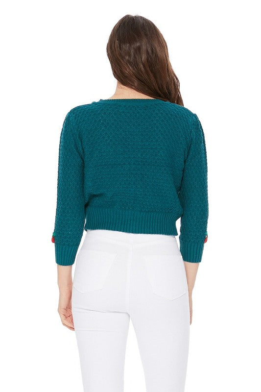 -17"-18" Crop Length, 3/4 Sleeves, Round Neck, Waffle, Honeycomb Knit Cardigan Sweater with Cute Cherry Pompom.