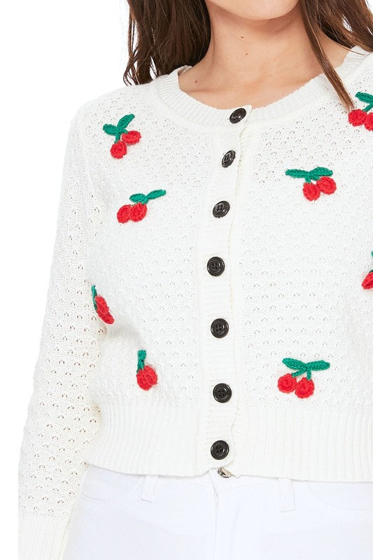 Cherry Crochet Pom Pom Cropped Cardigan Sweater