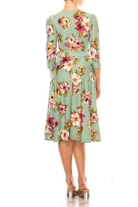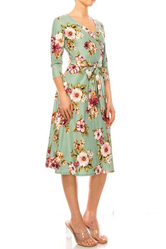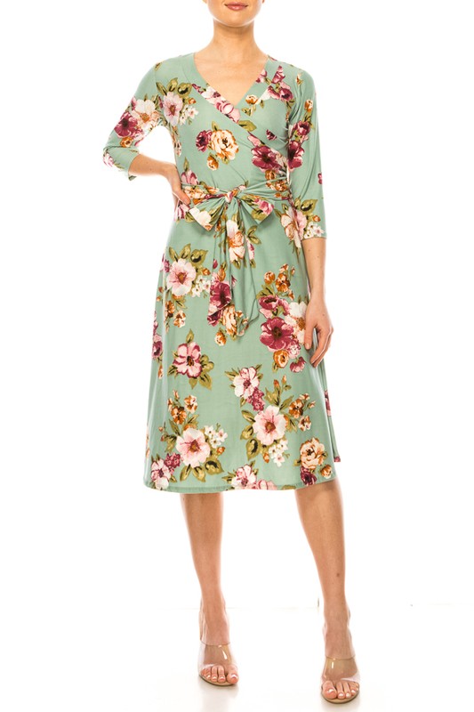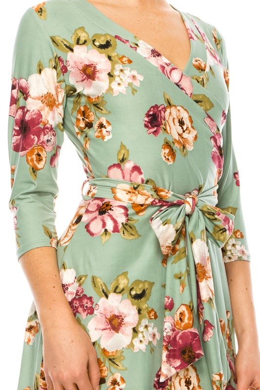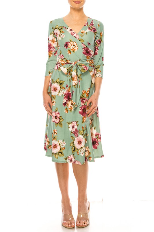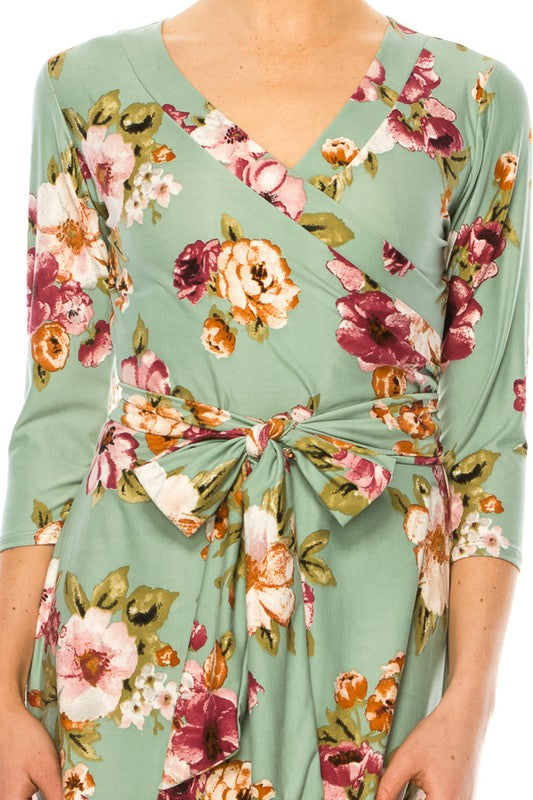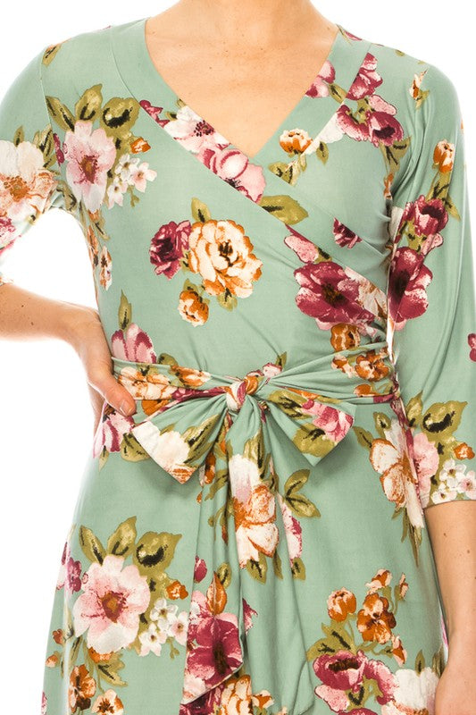 MOA Collection Floral Print Faux Wrap Dress with Deep V-Neck and Waist Tie