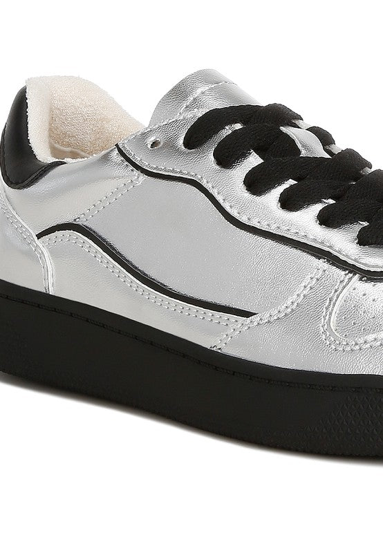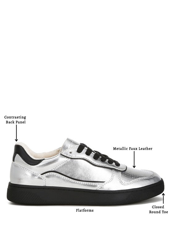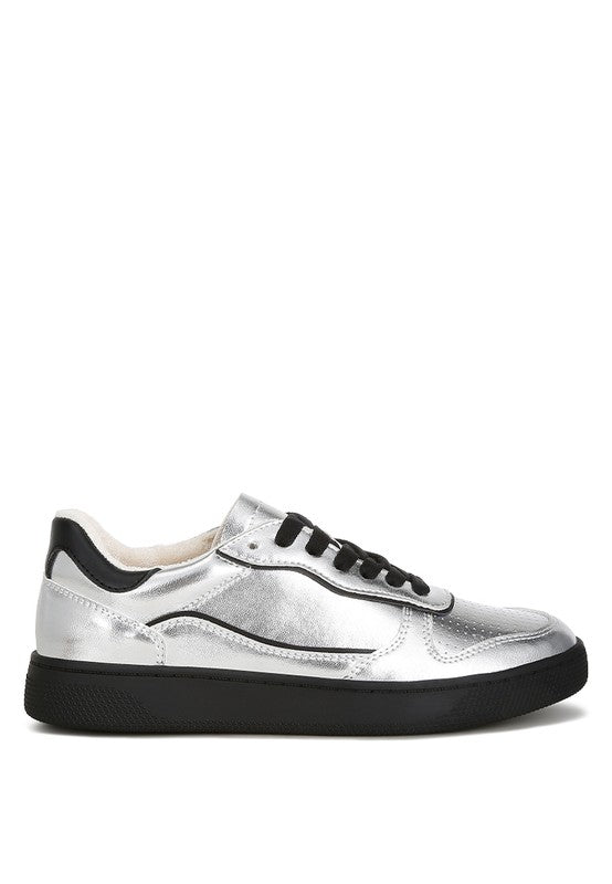These metallic faux leather sneakers are perfect for those craving comfort in their footwear. They have a comfortable cushion insole and a contrasting back panel for a touch of drama. Pair them with boyfriend jeans or graphic tees, and you're ready for the day!