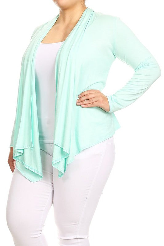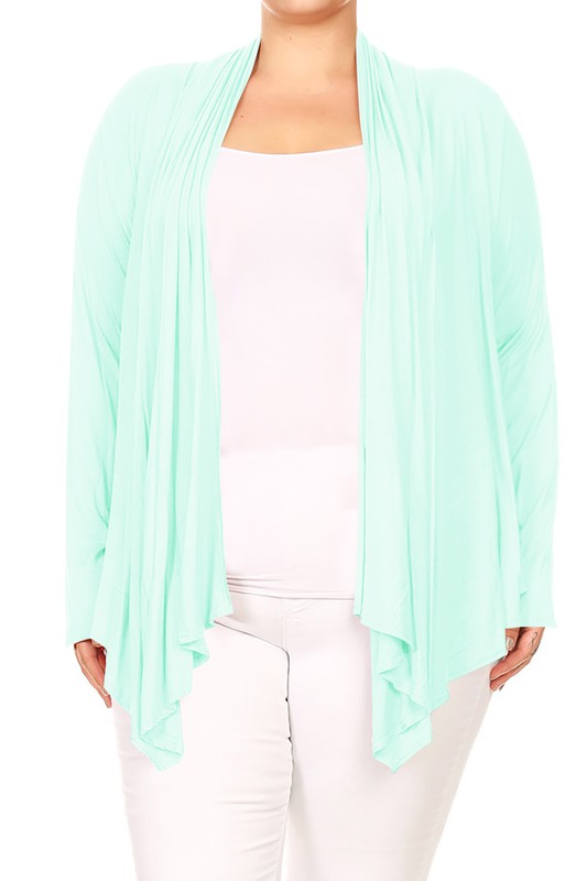 This cardigan is made of a soft and stretchy jersey knit fabric that drapes beautifully when worn. It features an open front design, which means there are no buttons or zippers to fasten it closed, making it easy to throw on over any outfit. The long sleeves provide coverage and warmth, making it perfect for cooler weather.