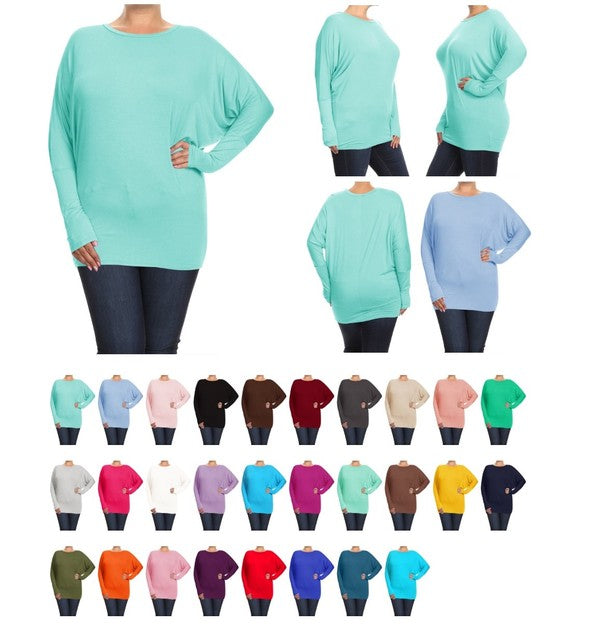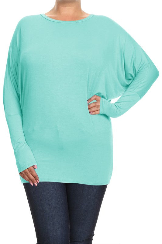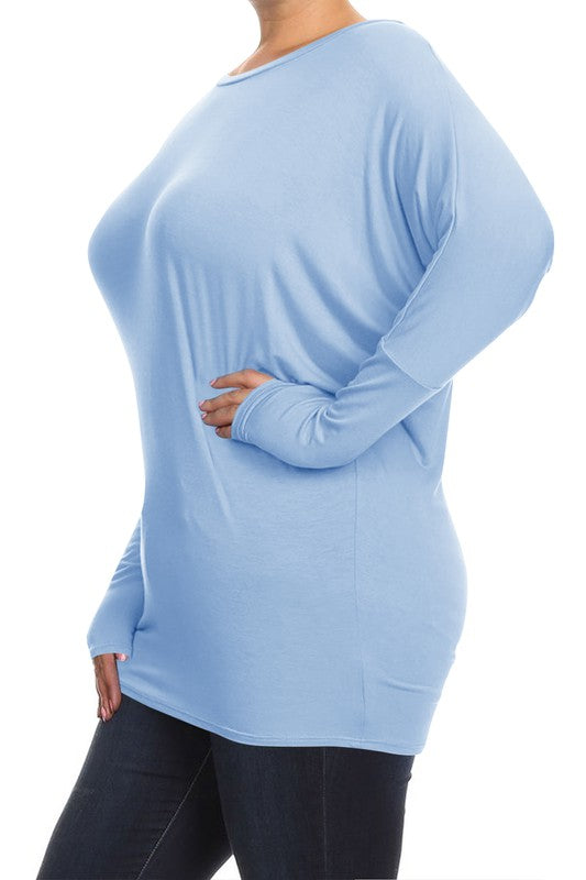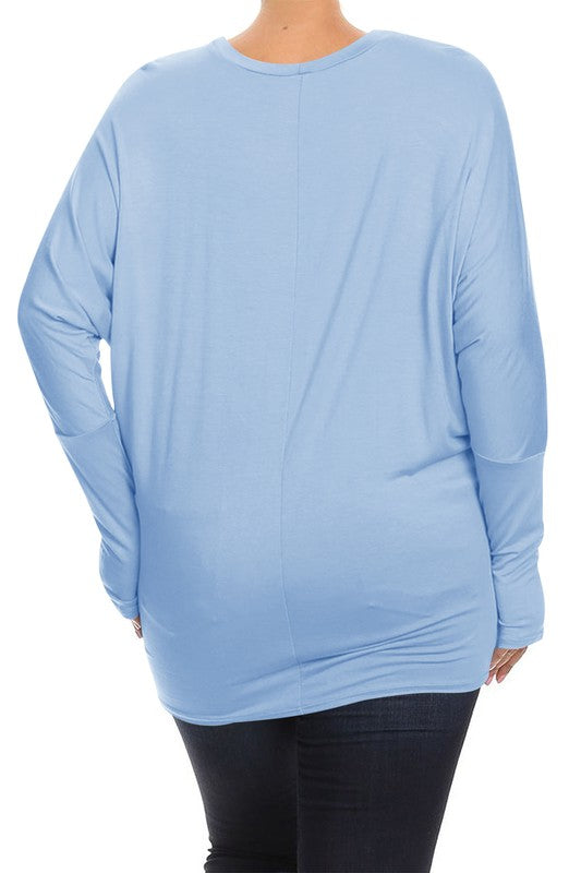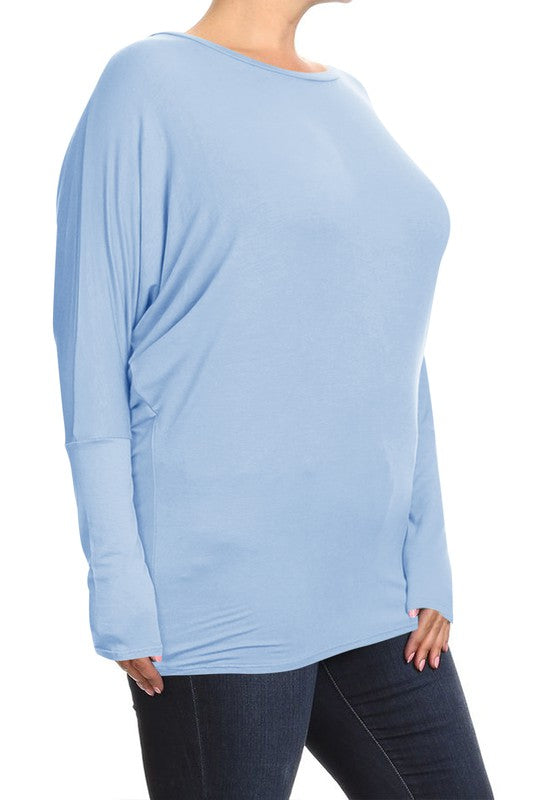 This plus size top is made from a soft and stretchy jersey knit fabric, which is known for its comfortable and easy-to-wear properties. The solid color of the fabric gives the top a clean and classic look, making it versatile and easy to dress up or down.