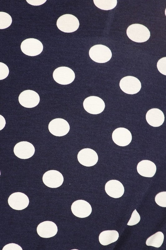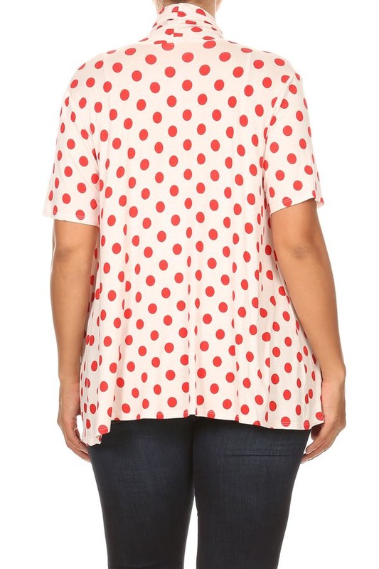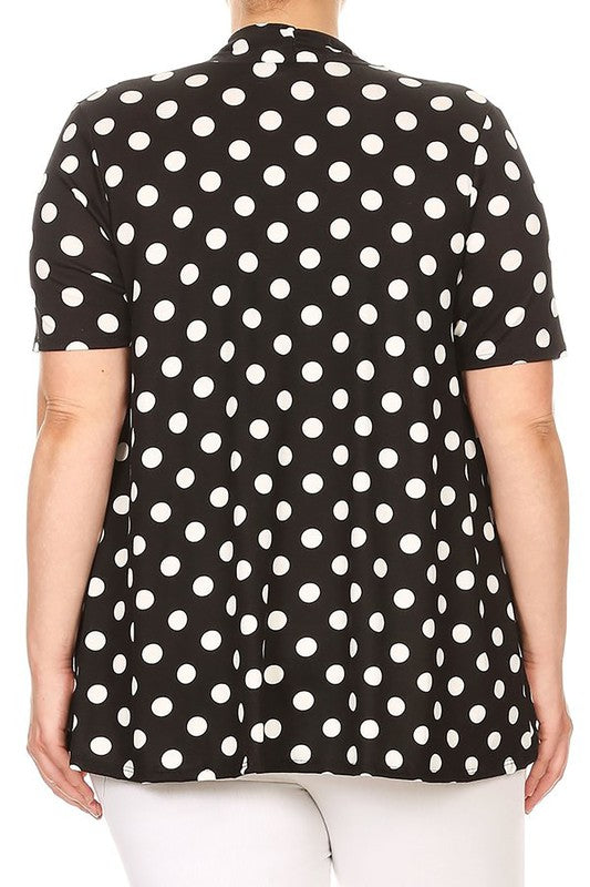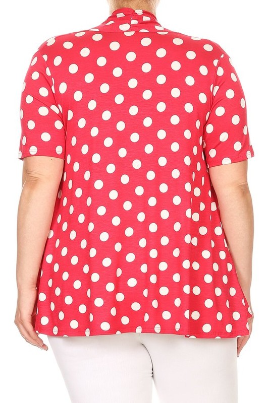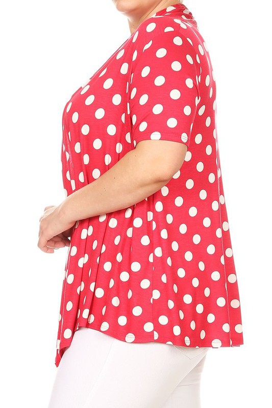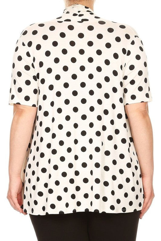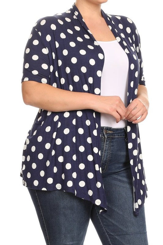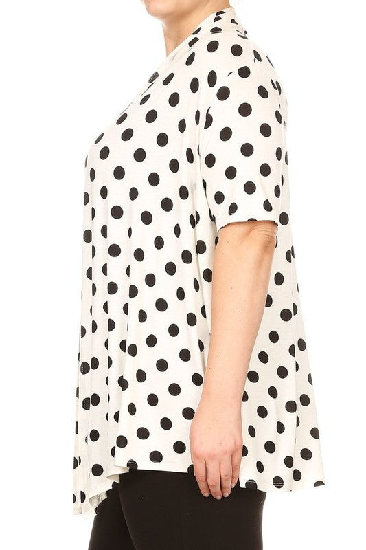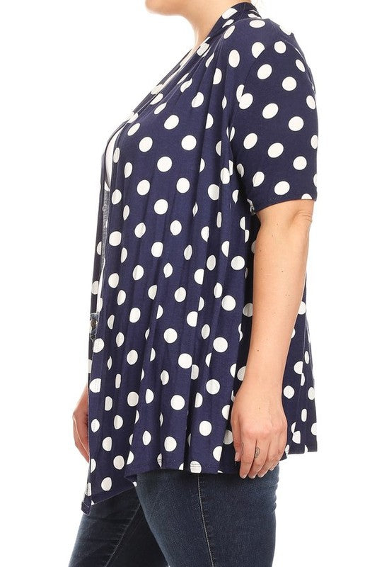 Polka dot print, loose fit cardigan with an open front, short sleeves, and asymmetrical hem.