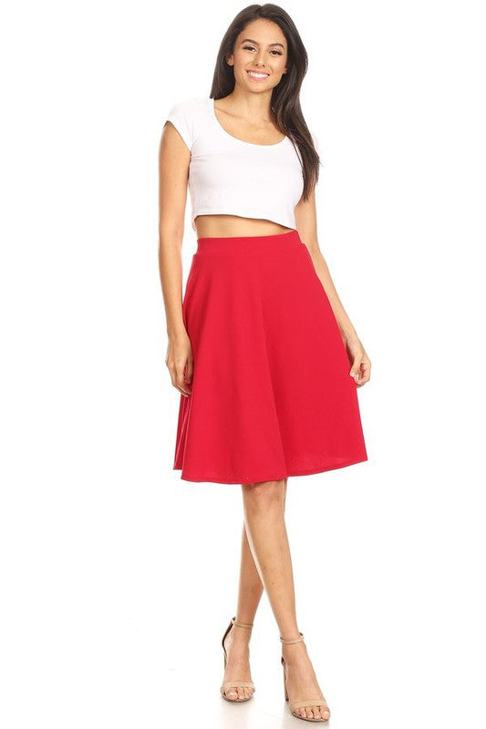 Solid, high waisted, A-line, knee length skirt with elastic waist.